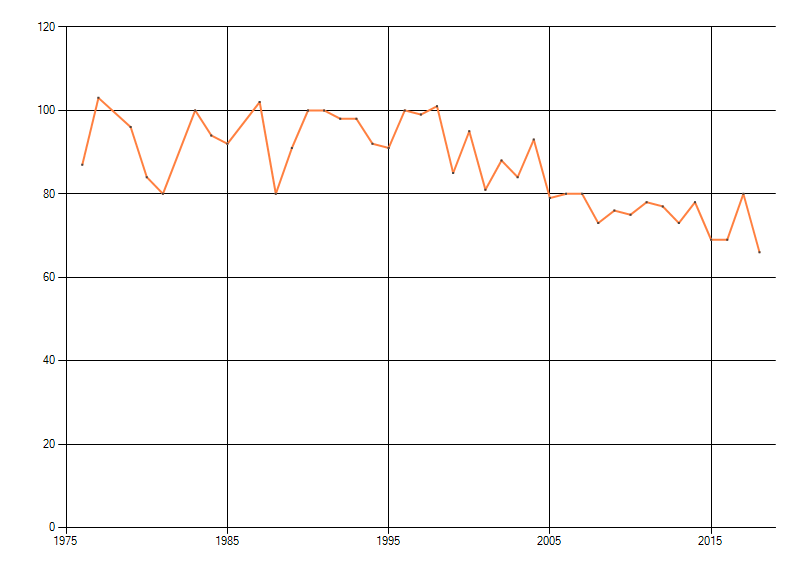 Gemiddelde trend van het aantal kilometerhokken waarin de soort voorkomt, weergegeven als indexcijfer (1975-1978 = 100). De trend is gecorrigeerd voor waarnemersinspanning en geeft de relatieve verandering in het aantal bezette kilometerhokken weer. Voor de berekening worden de data per periode van vier jaar samengenomen. In de grafiek correspondeert ieder punt met het laatste jaar van zo'n periode.
