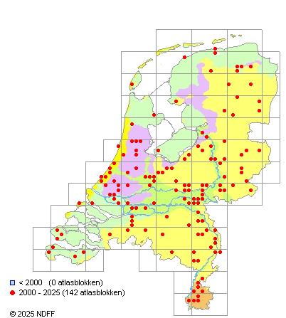 Het aantal atlasblokken (5x5 km) waarin de soort is gemeld binnen een periode van vijf jaar (vanaf 1980) of twintig jaar. Niet gecorrigeerd voor waarnemersinspanning en het aantal doorgegeven waarnemingen kan sterk variëren per periode, dus een trend in verspreiding kan hier niet direct uit worden afgelezen. Het opgegeven jaartal is het eerste jaar van de periode. Bron: gevalideerde waarnemingen uit de NDFF.
