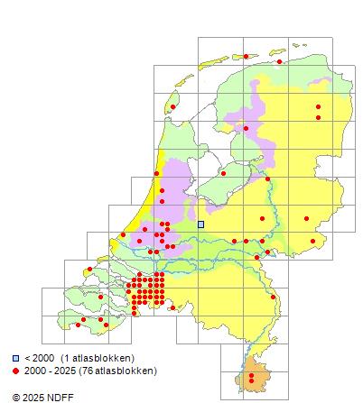 Het aantal atlasblokken (5x5 km) waarin de soort is gemeld binnen een periode van vijf jaar (vanaf 1980) of twintig jaar. Niet gecorrigeerd voor waarnemersinspanning en het aantal doorgegeven waarnemingen kan sterk variëren per periode, dus een trend in verspreiding kan hier niet direct uit worden afgelezen. Het opgegeven jaartal is het eerste jaar van de periode. Bron: gevalideerde waarnemingen uit de NDFF.