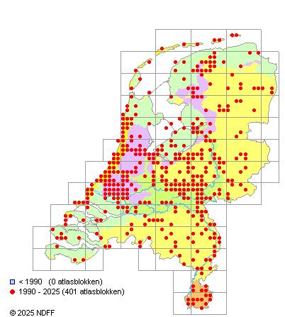 Het aantal atlasblokken (5x5 km) waarin de soort is gemeld binnen een periode van vijf jaar (vanaf 1980) of twintig jaar. Niet gecorrigeerd voor waarnemersinspanning en het aantal doorgegeven waarnemingen kan sterk variëren per periode, dus een trend in verspreiding kan hier niet direct uit worden afgelezen. Het opgegeven jaartal is het eerste jaar van de periode. Bron: gevalideerde waarnemingen uit de NDFF.
