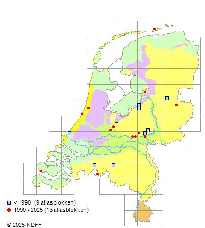 Het aantal atlasblokken (5x5 km) waarin de soort is gemeld binnen een periode van vijf jaar (vanaf 1980) of twintig jaar. Niet gecorrigeerd voor waarnemersinspanning en het aantal doorgegeven waarnemingen kan sterk variëren per periode, dus een trend in verspreiding kan hier niet direct uit worden afgelezen. Het opgegeven jaartal is het eerste jaar van de periode. Bron: gevalideerde waarnemingen uit de NDFF.