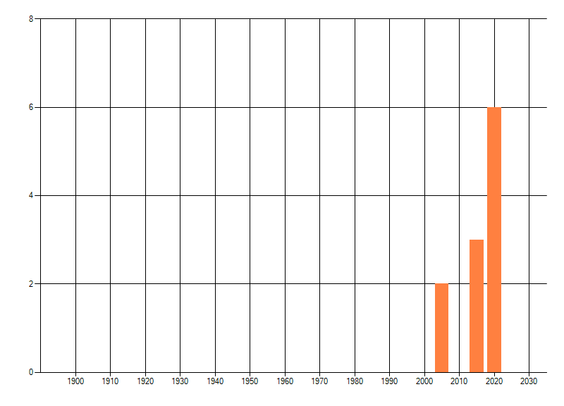 Het aantal atlasblokken (5x5 km) waarin de soort is gemeld binnen een periode van vijf jaar (vanaf 1980) of twintig jaar. Niet gecorrigeerd voor waarnemersinspanning en het aantal doorgegeven waarnemingen kan sterk variëren per periode, dus een trend in verspreiding kan hier niet direct uit worden afgelezen. Het opgegeven jaartal is het eerste jaar van de periode. Bron: gevalideerde waarnemingen uit de NDFF.