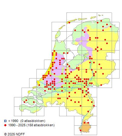 Het aantal atlasblokken (5x5 km) waarin de soort is gemeld binnen een periode van vijf jaar (vanaf 1980) of twintig jaar. Niet gecorrigeerd voor waarnemersinspanning en het aantal doorgegeven waarnemingen kan sterk variëren per periode, dus een trend in verspreiding kan hier niet direct uit worden afgelezen. Het opgegeven jaartal is het eerste jaar van de periode. Bron: gevalideerde waarnemingen uit de NDFF.