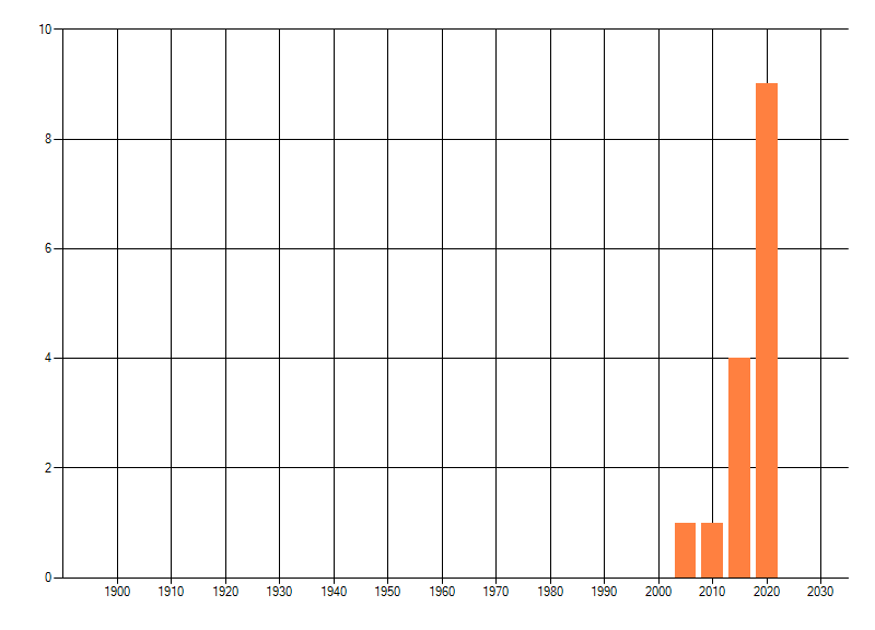 Het aantal atlasblokken (5x5 km) waarin de soort is gemeld binnen een periode van vijf jaar (vanaf 1980) of twintig jaar. Niet gecorrigeerd voor waarnemersinspanning en het aantal doorgegeven waarnemingen kan sterk variëren per periode, dus een trend in verspreiding kan hier niet direct uit worden afgelezen. Het opgegeven jaartal is het eerste jaar van de periode. Bron: gevalideerde waarnemingen uit de NDFF.