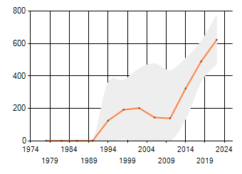 Gemiddelde trend van het aantal kilometerhokken waarin de soort voorkomt, weergegeven als indexcijfer (1975-1978 = 100). De trend is gecorrigeerd voor waarnemersinspanning en geeft de relatieve verandering in het aantal bezette kilometerhokken weer. Voor de berekening worden de data per periode van vier jaar samengenomen. In de grafiek correspondeert ieder punt met het laatste jaar van zo'n periode.