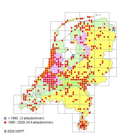 Het aantal atlasblokken (5x5 km) waarin de soort is gemeld binnen een periode van vijf jaar (vanaf 1980) of twintig jaar. Niet gecorrigeerd voor waarnemersinspanning en het aantal doorgegeven waarnemingen kan sterk variëren per periode, dus een trend in verspreiding kan hier niet direct uit worden afgelezen. Het opgegeven jaartal is het eerste jaar van de periode. Bron: gevalideerde waarnemingen uit de NDFF.
