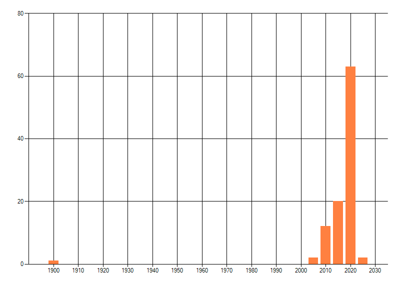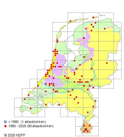 Het aantal atlasblokken (5x5 km) waarin de soort is gemeld binnen een periode van vijf jaar (vanaf 1980) of twintig jaar. Niet gecorrigeerd voor waarnemersinspanning en het aantal doorgegeven waarnemingen kan sterk variëren per periode, dus een trend in verspreiding kan hier niet direct uit worden afgelezen. Het opgegeven jaartal is het eerste jaar van de periode. Bron: gevalideerde waarnemingen uit de NDFF.