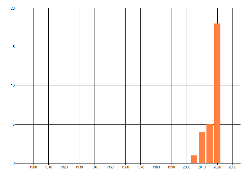 Het aantal atlasblokken (5x5 km) waarin de soort is gemeld binnen een periode van vijf jaar (vanaf 1980) of twintig jaar. Niet gecorrigeerd voor waarnemersinspanning en het aantal doorgegeven waarnemingen kan sterk variëren per periode, dus een trend in verspreiding kan hier niet direct uit worden afgelezen. Het opgegeven jaartal is het eerste jaar van de periode. Bron: gevalideerde waarnemingen uit de NDFF.