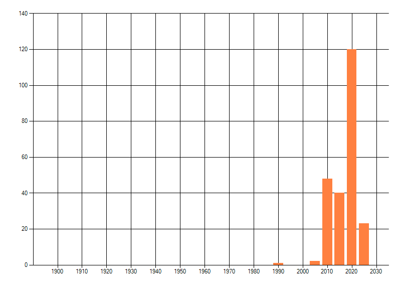 Het aantal atlasblokken (5x5 km) waarin de soort is gemeld binnen een periode van vijf jaar (vanaf 1980) of twintig jaar. Niet gecorrigeerd voor waarnemersinspanning en het aantal doorgegeven waarnemingen kan sterk variëren per periode, dus een trend in verspreiding kan hier niet direct uit worden afgelezen. Het opgegeven jaartal is het eerste jaar van de periode. Bron: gevalideerde waarnemingen uit de NDFF.