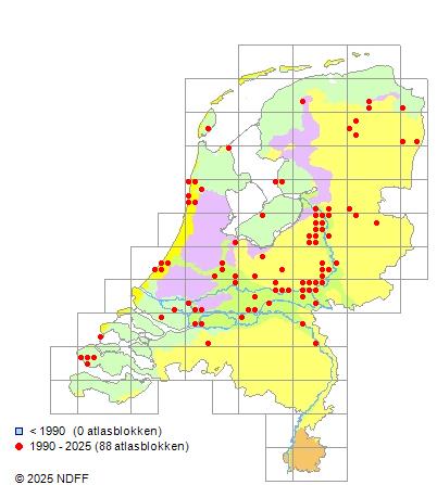 Het aantal atlasblokken (5x5 km) waarin de soort is gemeld binnen een periode van vijf jaar (vanaf 1980) of twintig jaar. Niet gecorrigeerd voor waarnemersinspanning en het aantal doorgegeven waarnemingen kan sterk variëren per periode, dus een trend in verspreiding kan hier niet direct uit worden afgelezen. Het opgegeven jaartal is het eerste jaar van de periode. Bron: gevalideerde waarnemingen uit de NDFF.