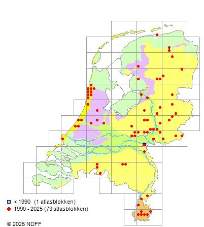 Het aantal atlasblokken (5x5 km) waarin de soort is gemeld binnen een periode van vijf jaar (vanaf 1980) of twintig jaar. Niet gecorrigeerd voor waarnemersinspanning en het aantal doorgegeven waarnemingen kan sterk variëren per periode, dus een trend in verspreiding kan hier niet direct uit worden afgelezen. Het opgegeven jaartal is het eerste jaar van de periode. Bron: gevalideerde waarnemingen uit de NDFF.