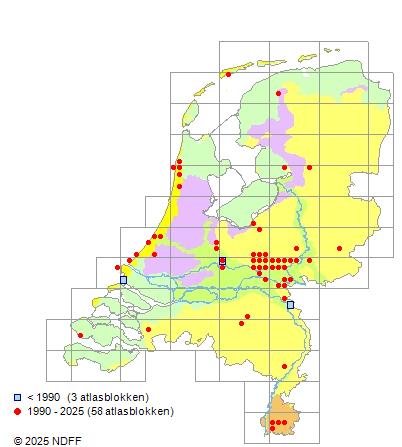 Het aantal atlasblokken (5x5 km) waarin de soort is gemeld binnen een periode van vijf jaar (vanaf 1980) of twintig jaar. Niet gecorrigeerd voor waarnemersinspanning en het aantal doorgegeven waarnemingen kan sterk variëren per periode, dus een trend in verspreiding kan hier niet direct uit worden afgelezen. Het opgegeven jaartal is het eerste jaar van de periode. Bron: gevalideerde waarnemingen uit de NDFF.