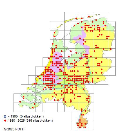 Het aantal atlasblokken (5x5 km) waarin de soort is gemeld binnen een periode van vijf jaar (vanaf 1980) of twintig jaar. Niet gecorrigeerd voor waarnemersinspanning en het aantal doorgegeven waarnemingen kan sterk variëren per periode, dus een trend in verspreiding kan hier niet direct uit worden afgelezen. Het opgegeven jaartal is het eerste jaar van de periode. Bron: gevalideerde waarnemingen uit de NDFF.