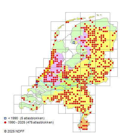 Het aantal atlasblokken (5x5 km) waarin de soort is gemeld binnen een periode van vijf jaar (vanaf 1980) of twintig jaar. Niet gecorrigeerd voor waarnemersinspanning en het aantal doorgegeven waarnemingen kan sterk variëren per periode, dus een trend in verspreiding kan hier niet direct uit worden afgelezen. Het opgegeven jaartal is het eerste jaar van de periode. Bron: gevalideerde waarnemingen uit de NDFF.