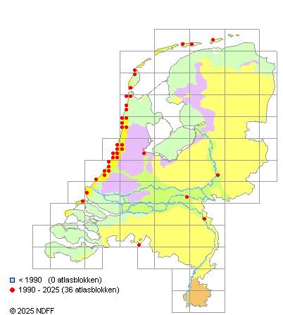 Het aantal atlasblokken (5x5 km) waarin de soort is gemeld binnen een periode van vijf jaar (vanaf 1980) of twintig jaar. Niet gecorrigeerd voor waarnemersinspanning en het aantal doorgegeven waarnemingen kan sterk variëren per periode, dus een trend in verspreiding kan hier niet direct uit worden afgelezen. Het opgegeven jaartal is het eerste jaar van de periode. Bron: gevalideerde waarnemingen uit de NDFF.