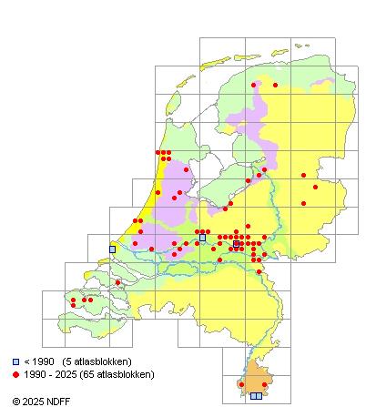 Het aantal atlasblokken (5x5 km) waarin de soort is gemeld binnen een periode van vijf jaar (vanaf 1980) of twintig jaar. Niet gecorrigeerd voor waarnemersinspanning en het aantal doorgegeven waarnemingen kan sterk variëren per periode, dus een trend in verspreiding kan hier niet direct uit worden afgelezen. Het opgegeven jaartal is het eerste jaar van de periode. Bron: gevalideerde waarnemingen uit de NDFF.