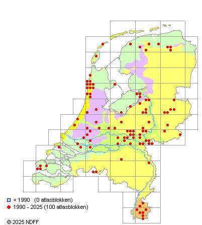 Het aantal atlasblokken (5x5 km) waarin de soort is gemeld binnen een periode van vijf jaar (vanaf 1980) of twintig jaar. Niet gecorrigeerd voor waarnemersinspanning en het aantal doorgegeven waarnemingen kan sterk variëren per periode, dus een trend in verspreiding kan hier niet direct uit worden afgelezen. Het opgegeven jaartal is het eerste jaar van de periode. Bron: gevalideerde waarnemingen uit de NDFF.