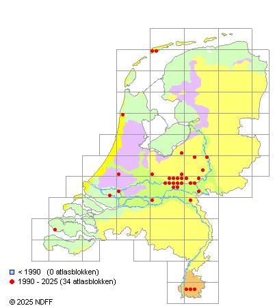 Het aantal atlasblokken (5x5 km) waarin de soort is gemeld binnen een periode van vijf jaar (vanaf 1980) of twintig jaar. Niet gecorrigeerd voor waarnemersinspanning en het aantal doorgegeven waarnemingen kan sterk variëren per periode, dus een trend in verspreiding kan hier niet direct uit worden afgelezen. Het opgegeven jaartal is het eerste jaar van de periode. Bron: gevalideerde waarnemingen uit de NDFF.