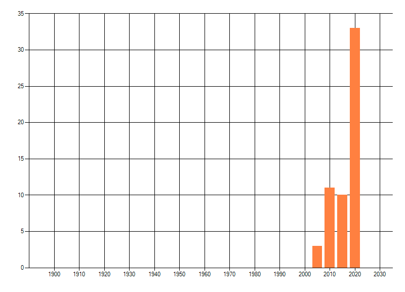 Het aantal atlasblokken (5x5 km) waarin de soort is gemeld binnen een periode van vijf jaar (vanaf 1980) of twintig jaar. Niet gecorrigeerd voor waarnemersinspanning en het aantal doorgegeven waarnemingen kan sterk variëren per periode, dus een trend in verspreiding kan hier niet direct uit worden afgelezen. Het opgegeven jaartal is het eerste jaar van de periode. Bron: gevalideerde waarnemingen uit de NDFF.