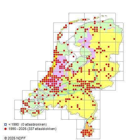 Het aantal atlasblokken (5x5 km) waarin de soort is gemeld binnen een periode van vijf jaar (vanaf 1980) of twintig jaar. Niet gecorrigeerd voor waarnemersinspanning en het aantal doorgegeven waarnemingen kan sterk variëren per periode, dus een trend in verspreiding kan hier niet direct uit worden afgelezen. Het opgegeven jaartal is het eerste jaar van de periode. Bron: gevalideerde waarnemingen uit de NDFF.