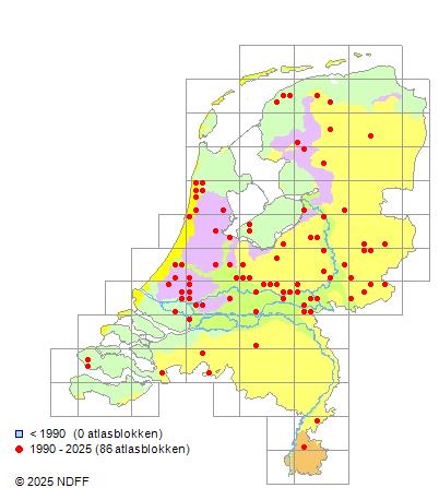Het aantal atlasblokken (5x5 km) waarin de soort is gemeld binnen een periode van vijf jaar (vanaf 1980) of twintig jaar. Niet gecorrigeerd voor waarnemersinspanning en het aantal doorgegeven waarnemingen kan sterk variëren per periode, dus een trend in verspreiding kan hier niet direct uit worden afgelezen. Het opgegeven jaartal is het eerste jaar van de periode. Bron: gevalideerde waarnemingen uit de NDFF.