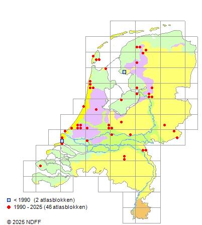 Het aantal atlasblokken (5x5 km) waarin de soort is gemeld binnen een periode van vijf jaar (vanaf 1980) of twintig jaar. Niet gecorrigeerd voor waarnemersinspanning en het aantal doorgegeven waarnemingen kan sterk variëren per periode, dus een trend in verspreiding kan hier niet direct uit worden afgelezen. Het opgegeven jaartal is het eerste jaar van de periode. Bron: gevalideerde waarnemingen uit de NDFF.