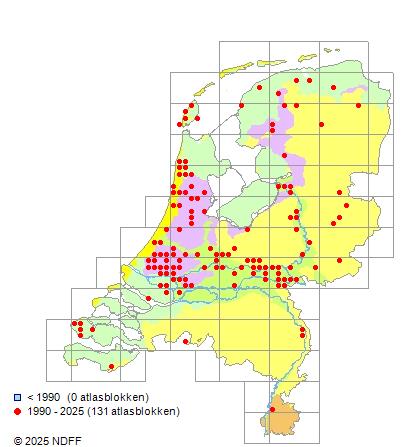 Het aantal atlasblokken (5x5 km) waarin de soort is gemeld binnen een periode van vijf jaar (vanaf 1980) of twintig jaar. Niet gecorrigeerd voor waarnemersinspanning en het aantal doorgegeven waarnemingen kan sterk variëren per periode, dus een trend in verspreiding kan hier niet direct uit worden afgelezen. Het opgegeven jaartal is het eerste jaar van de periode. Bron: gevalideerde waarnemingen uit de NDFF.