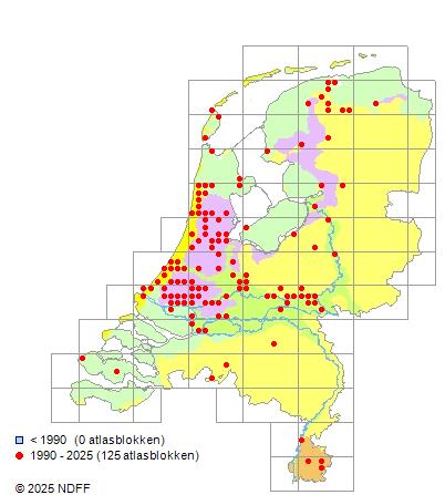 Het aantal atlasblokken (5x5 km) waarin de soort is gemeld binnen een periode van vijf jaar (vanaf 1980) of twintig jaar. Niet gecorrigeerd voor waarnemersinspanning en het aantal doorgegeven waarnemingen kan sterk variëren per periode, dus een trend in verspreiding kan hier niet direct uit worden afgelezen. Het opgegeven jaartal is het eerste jaar van de periode. Bron: gevalideerde waarnemingen uit de NDFF.