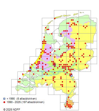 Het aantal atlasblokken (5x5 km) waarin de soort is gemeld binnen een periode van vijf jaar (vanaf 1980) of twintig jaar. Niet gecorrigeerd voor waarnemersinspanning en het aantal doorgegeven waarnemingen kan sterk variëren per periode, dus een trend in verspreiding kan hier niet direct uit worden afgelezen. Het opgegeven jaartal is het eerste jaar van de periode. Bron: gevalideerde waarnemingen uit de NDFF.