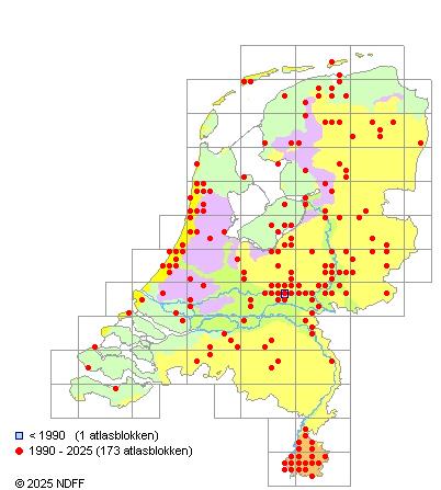 Het aantal atlasblokken (5x5 km) waarin de soort is gemeld binnen een periode van vijf jaar (vanaf 1980) of twintig jaar. Niet gecorrigeerd voor waarnemersinspanning en het aantal doorgegeven waarnemingen kan sterk variëren per periode, dus een trend in verspreiding kan hier niet direct uit worden afgelezen. Het opgegeven jaartal is het eerste jaar van de periode. Bron: gevalideerde waarnemingen uit de NDFF.