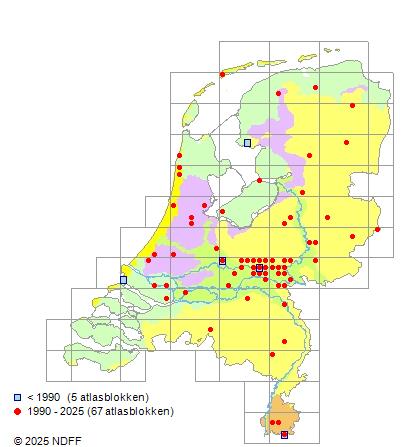 Het aantal atlasblokken (5x5 km) waarin de soort is gemeld binnen een periode van vijf jaar (vanaf 1980) of twintig jaar. Niet gecorrigeerd voor waarnemersinspanning en het aantal doorgegeven waarnemingen kan sterk variëren per periode, dus een trend in verspreiding kan hier niet direct uit worden afgelezen. Het opgegeven jaartal is het eerste jaar van de periode. Bron: gevalideerde waarnemingen uit de NDFF.