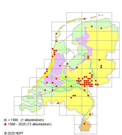 Het aantal atlasblokken (5x5 km) waarin de soort is gemeld binnen een periode van vijf jaar (vanaf 1980) of twintig jaar. Niet gecorrigeerd voor waarnemersinspanning en het aantal doorgegeven waarnemingen kan sterk variëren per periode, dus een trend in verspreiding kan hier niet direct uit worden afgelezen. Het opgegeven jaartal is het eerste jaar van de periode. Bron: gevalideerde waarnemingen uit de NDFF.