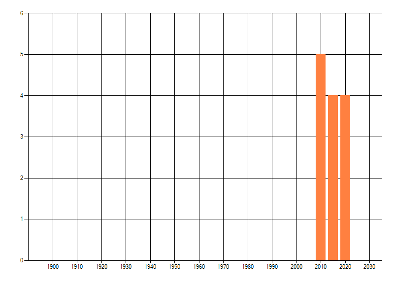 Het aantal atlasblokken (5x5 km) waarin de soort is gemeld binnen een periode van vijf jaar (vanaf 1980) of twintig jaar. Niet gecorrigeerd voor waarnemersinspanning en het aantal doorgegeven waarnemingen kan sterk variëren per periode, dus een trend in verspreiding kan hier niet direct uit worden afgelezen. Het opgegeven jaartal is het eerste jaar van de periode. Bron: gevalideerde waarnemingen uit de NDFF.