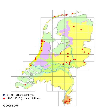 Het aantal atlasblokken (5x5 km) waarin de soort is gemeld binnen een periode van vijf jaar (vanaf 1980) of twintig jaar. Niet gecorrigeerd voor waarnemersinspanning en het aantal doorgegeven waarnemingen kan sterk variëren per periode, dus een trend in verspreiding kan hier niet direct uit worden afgelezen. Het opgegeven jaartal is het eerste jaar van de periode. Bron: gevalideerde waarnemingen uit de NDFF.