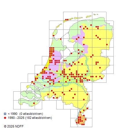 Het aantal atlasblokken (5x5 km) waarin de soort is gemeld binnen een periode van vijf jaar (vanaf 1980) of twintig jaar. Niet gecorrigeerd voor waarnemersinspanning en het aantal doorgegeven waarnemingen kan sterk variëren per periode, dus een trend in verspreiding kan hier niet direct uit worden afgelezen. Het opgegeven jaartal is het eerste jaar van de periode. Bron: gevalideerde waarnemingen uit de NDFF.