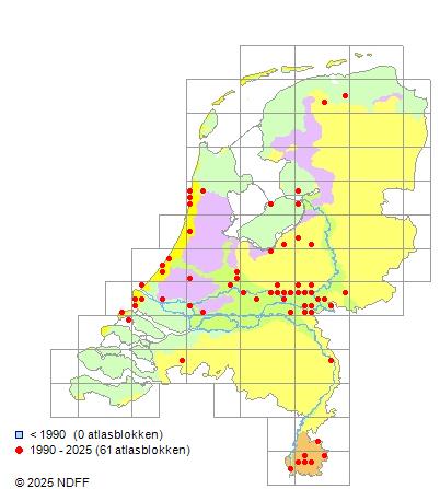 Het aantal atlasblokken (5x5 km) waarin de soort is gemeld binnen een periode van vijf jaar (vanaf 1980) of twintig jaar. Niet gecorrigeerd voor waarnemersinspanning en het aantal doorgegeven waarnemingen kan sterk variëren per periode, dus een trend in verspreiding kan hier niet direct uit worden afgelezen. Het opgegeven jaartal is het eerste jaar van de periode. Bron: gevalideerde waarnemingen uit de NDFF.