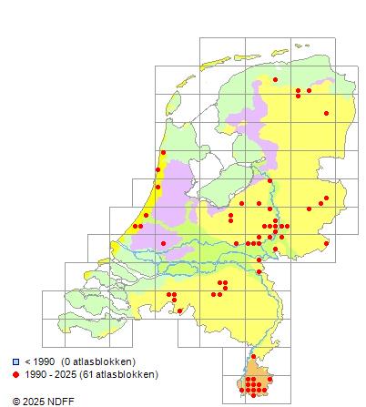 Het aantal atlasblokken (5x5 km) waarin de soort is gemeld binnen een periode van vijf jaar (vanaf 1980) of twintig jaar. Niet gecorrigeerd voor waarnemersinspanning en het aantal doorgegeven waarnemingen kan sterk variëren per periode, dus een trend in verspreiding kan hier niet direct uit worden afgelezen. Het opgegeven jaartal is het eerste jaar van de periode. Bron: gevalideerde waarnemingen uit de NDFF.