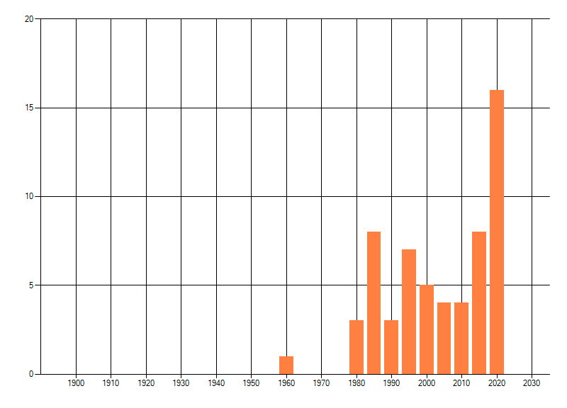 Het aantal atlasblokken (5x5 km) waarin de soort is gemeld binnen een periode van vijf jaar (vanaf 1980) of twintig jaar. Niet gecorrigeerd voor waarnemersinspanning en het aantal doorgegeven waarnemingen kan sterk variëren per periode, dus een trend in verspreiding kan hier niet direct uit worden afgelezen. Het opgegeven jaartal is het eerste jaar van de periode. Bron: gevalideerde waarnemingen uit de NDFF.