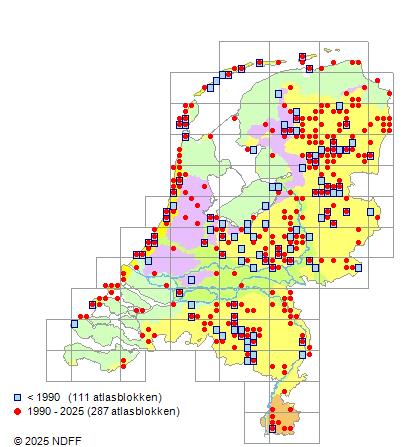 Het aantal atlasblokken (5x5 km) waarin de soort is gemeld binnen een periode van vijf jaar (vanaf 1980) of twintig jaar. Niet gecorrigeerd voor waarnemersinspanning en het aantal doorgegeven waarnemingen kan sterk variëren per periode, dus een trend in verspreiding kan hier niet direct uit worden afgelezen. Het opgegeven jaartal is het eerste jaar van de periode. Bron: gevalideerde waarnemingen uit de NDFF.