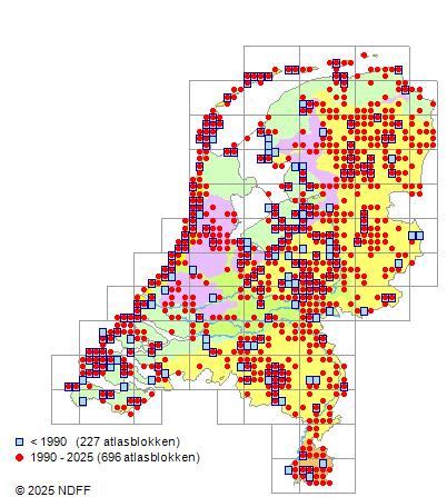 Het aantal atlasblokken (5x5 km) waarin de soort is gemeld binnen een periode van vijf jaar (vanaf 1980) of twintig jaar. Niet gecorrigeerd voor waarnemersinspanning en het aantal doorgegeven waarnemingen kan sterk variëren per periode, dus een trend in verspreiding kan hier niet direct uit worden afgelezen. Het opgegeven jaartal is het eerste jaar van de periode. Bron: gevalideerde waarnemingen uit de NDFF.