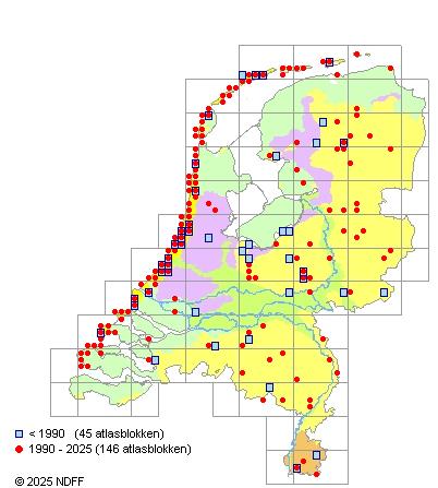 Het aantal atlasblokken (5x5 km) waarin de soort is gemeld binnen een periode van vijf jaar (vanaf 1980) of twintig jaar. Niet gecorrigeerd voor waarnemersinspanning en het aantal doorgegeven waarnemingen kan sterk variëren per periode, dus een trend in verspreiding kan hier niet direct uit worden afgelezen. Het opgegeven jaartal is het eerste jaar van de periode. Bron: gevalideerde waarnemingen uit de NDFF.