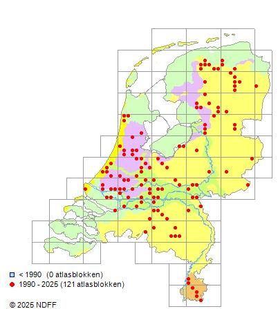 Het aantal atlasblokken (5x5 km) waarin de soort is gemeld binnen een periode van vijf jaar (vanaf 1980) of twintig jaar. Niet gecorrigeerd voor waarnemersinspanning en het aantal doorgegeven waarnemingen kan sterk variëren per periode, dus een trend in verspreiding kan hier niet direct uit worden afgelezen. Het opgegeven jaartal is het eerste jaar van de periode. Bron: gevalideerde waarnemingen uit de NDFF.
