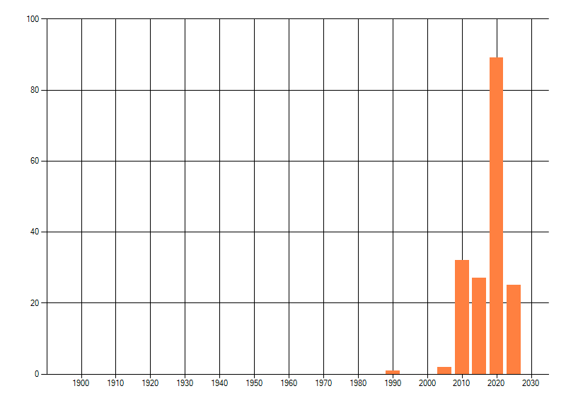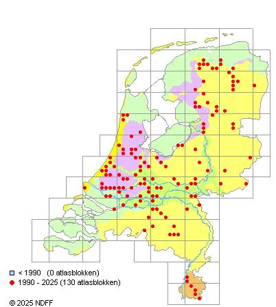 Het aantal atlasblokken (5x5 km) waarin de soort is gemeld binnen een periode van vijf jaar (vanaf 1980) of twintig jaar. Niet gecorrigeerd voor waarnemersinspanning en het aantal doorgegeven waarnemingen kan sterk variëren per periode, dus een trend in verspreiding kan hier niet direct uit worden afgelezen. Het opgegeven jaartal is het eerste jaar van de periode. Bron: gevalideerde waarnemingen uit de NDFF.