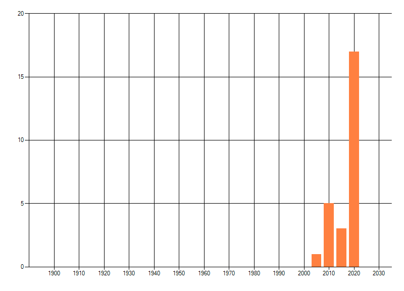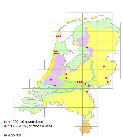 Het aantal atlasblokken (5x5 km) waarin de soort is gemeld binnen een periode van vijf jaar (vanaf 1980) of twintig jaar. Niet gecorrigeerd voor waarnemersinspanning en het aantal doorgegeven waarnemingen kan sterk variëren per periode, dus een trend in verspreiding kan hier niet direct uit worden afgelezen. Het opgegeven jaartal is het eerste jaar van de periode. Bron: gevalideerde waarnemingen uit de NDFF.