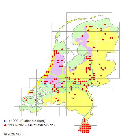 Het aantal atlasblokken (5x5 km) waarin de soort is gemeld binnen een periode van vijf jaar (vanaf 1980) of twintig jaar. Niet gecorrigeerd voor waarnemersinspanning en het aantal doorgegeven waarnemingen kan sterk variëren per periode, dus een trend in verspreiding kan hier niet direct uit worden afgelezen. Het opgegeven jaartal is het eerste jaar van de periode. Bron: gevalideerde waarnemingen uit de NDFF.