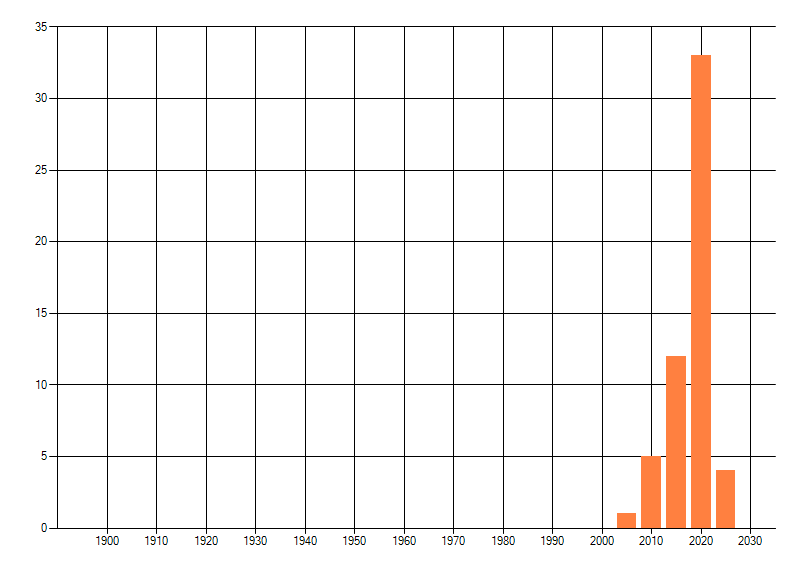 Het aantal atlasblokken (5x5 km) waarin de soort is gemeld binnen een periode van vijf jaar (vanaf 1980) of twintig jaar. Niet gecorrigeerd voor waarnemersinspanning en het aantal doorgegeven waarnemingen kan sterk variëren per periode, dus een trend in verspreiding kan hier niet direct uit worden afgelezen. Het opgegeven jaartal is het eerste jaar van de periode. Bron: gevalideerde waarnemingen uit de NDFF.