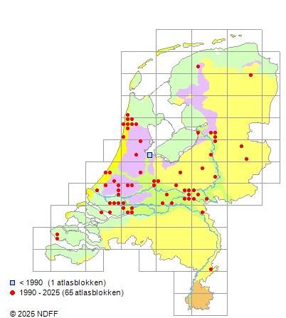 Het aantal atlasblokken (5x5 km) waarin de soort is gemeld binnen een periode van vijf jaar (vanaf 1980) of twintig jaar. Niet gecorrigeerd voor waarnemersinspanning en het aantal doorgegeven waarnemingen kan sterk variëren per periode, dus een trend in verspreiding kan hier niet direct uit worden afgelezen. Het opgegeven jaartal is het eerste jaar van de periode. Bron: gevalideerde waarnemingen uit de NDFF.