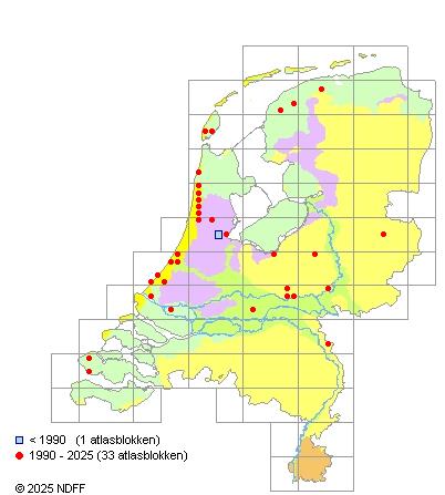 Het aantal atlasblokken (5x5 km) waarin de soort is gemeld binnen een periode van vijf jaar (vanaf 1980) of twintig jaar. Niet gecorrigeerd voor waarnemersinspanning en het aantal doorgegeven waarnemingen kan sterk variëren per periode, dus een trend in verspreiding kan hier niet direct uit worden afgelezen. Het opgegeven jaartal is het eerste jaar van de periode. Bron: gevalideerde waarnemingen uit de NDFF.