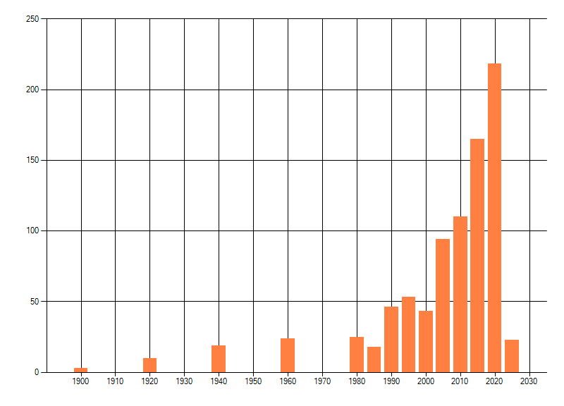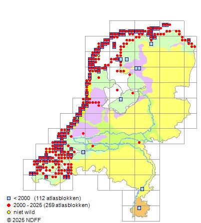 Het aantal atlasblokken (5x5 km) waarin de soort is gemeld binnen een periode van vijf jaar (vanaf 1980) of twintig jaar. Niet gecorrigeerd voor waarnemersinspanning en het aantal doorgegeven waarnemingen kan sterk variëren per periode, dus een trend in verspreiding kan hier niet direct uit worden afgelezen. Het opgegeven jaartal is het eerste jaar van de periode. Bron: gevalideerde waarnemingen uit de NDFF.