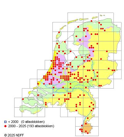 Het aantal atlasblokken (5x5 km) waarin de soort is gemeld binnen een periode van vijf jaar (vanaf 1980) of twintig jaar. Niet gecorrigeerd voor waarnemersinspanning en het aantal doorgegeven waarnemingen kan sterk variëren per periode, dus een trend in verspreiding kan hier niet direct uit worden afgelezen. Het opgegeven jaartal is het eerste jaar van de periode. Bron: gevalideerde waarnemingen uit de NDFF.